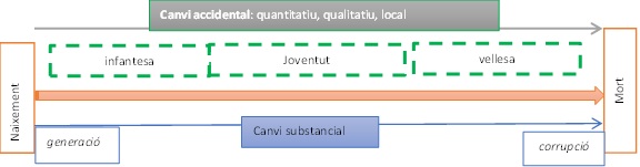 Aristòtil distingeix entre dos tipus de canvi: el canvi accidental i el canvi substancial. Un canvi és accidental quan la substància[1] és manté i només varien els seus accidents (quantitat, qualitat, lloc…). Un canvi és substancial quan es crea o desapareix una substància (generació-corrupció). Per exemple, el naixement d’un ésser (generació) o la mort (corrupció).