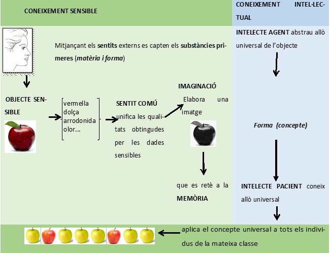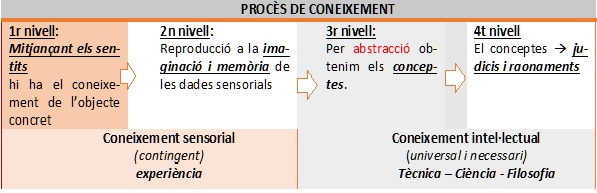 En termes generals, el procés del coneixement va dels sentits, que ens donen dades particulars i concretes, fins a la formulació de conceptes generals o universals. Aquest procés no es dona de manera immediata, sinó que passa per quatre nivells fonamentals: el primer nivell és el dels sentits. El coneixement comença amb la percepció dels objectes concrets mitjançant el sentits externs (vista, oïda, tacte, gust i olfacte). En aquest primer moment disposem de dades particulars i contingents de la realitat, és a dir, coneixem “aquest objecte concret” tal com és mostra. El segon nivell està format per la imaginació i la memòria: les dades captades pels sentits es conserven gràcies a la memòria i es poden reproduir mitjançant la imaginació. D’aquesta manera, encara que l’objecte ja no estigui present, la ment pot retenir-ne la imatge i recordar-ne les característiques. Aquí comença a aparèixer l’experiència, que és la repetició i acumulació de percepcions semblants. El tercer nivell està format per l’abstracció: aquest procés consisteix a separar, en els casos particulars, allò que és essencial i comú a tots. Gràcies a l’abstracció, la ment forma conceptes universal, que ens permeten entendre la realitat més enllà de l’individu concret. Per últim, el quart nivell: els judicis i raonaments: els conceptes universals serveixen de base per elaborar judicis (tots els homes són mortals) i raonaments més complexos. En aquest nivell, el coneixement esdevé universal i necessari, propi de la ciència, la tècnica i la filosofia.